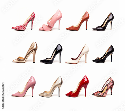 Composite photo collage of attractive smooth woman legs in colorful high heels background