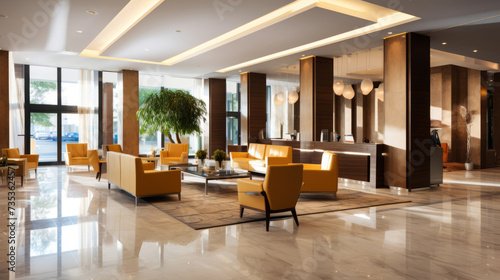 Elegant modern hotel lobby with yellow armchairs and reception desk