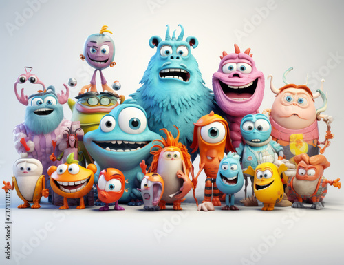 Colorful cartoon monsters with big eyes and cheerful expressions in a vibrant painting