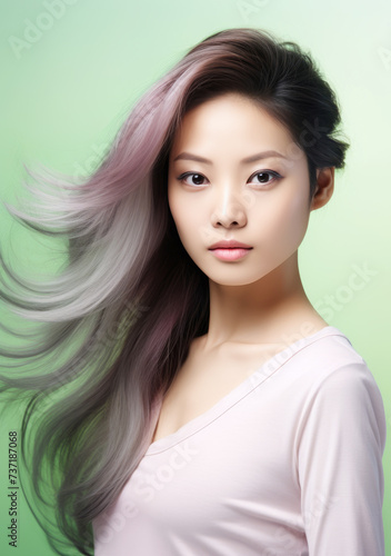 Portrait of a poised Asian woman in her 30s with long black hair wearing a white blazer, looking thoughtful and confident against a neutral background