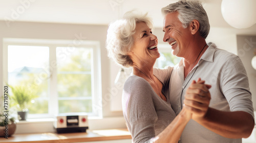 Affectionate senior couple dancing together in a cozy kitchen setting
