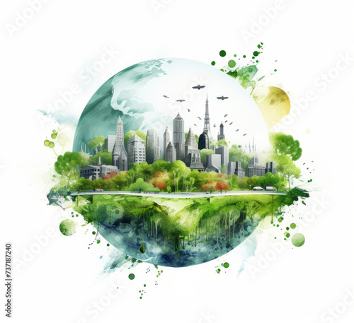 Sustainable living concept with green cityscape and forest integrated in a watercolor painted Earth