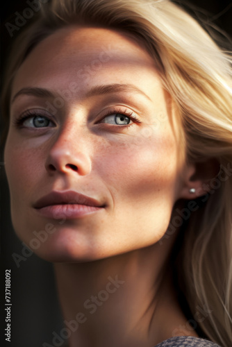 Elegant woman with flawless makeup and serene expression in a beauty portrait