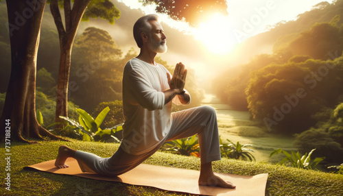 Morning yoga practice in a serene meadow at sunrise, wellness lifestyle