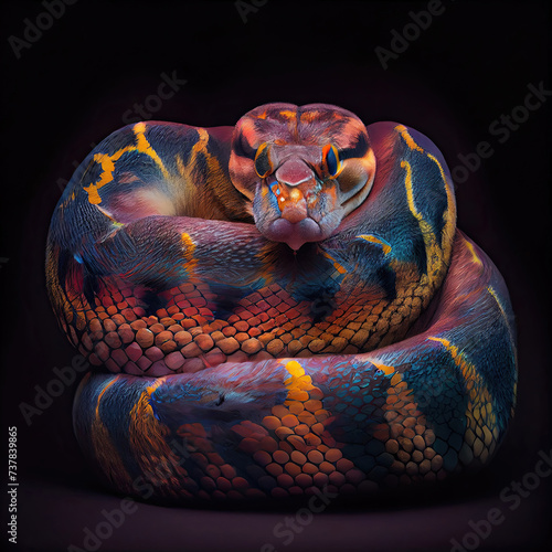 Close-up portrait of a striking snake in a studio setting with rich colors and detailed scales showcasing captivating reptile beauty