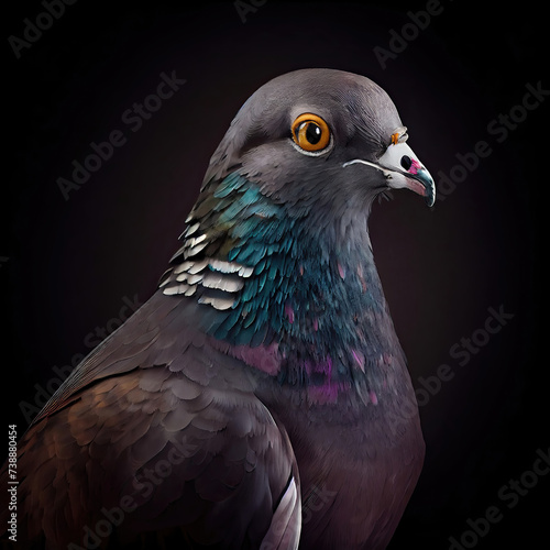 Vibrant portrait of a pigeon in studio with striking iridescent feathers against a purple background, showcasing the bird's beauty and detail.