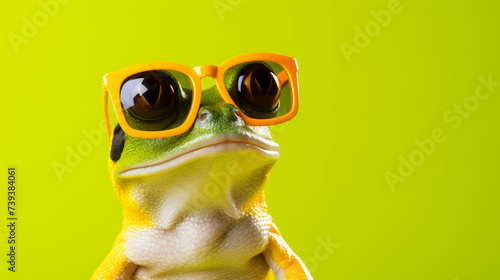 Stylish frog with orange sunglasses on a vibrant yellow background