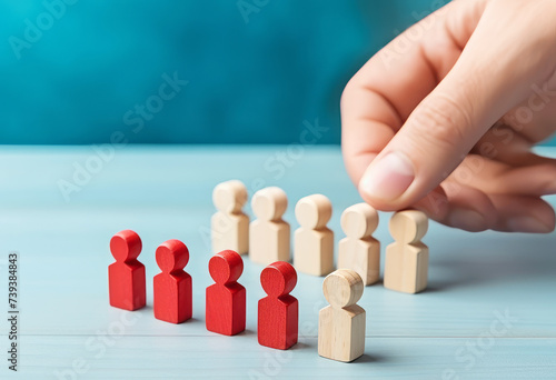 Red figure connected in network among wooden figures emphasizing communication concepts