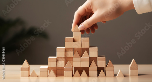 Hand stacking wooden blocks representing a green bar graph for growth and development