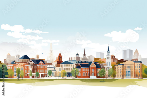Idyllic urban landscape with a variety of architectural styles under a clear, blue sky