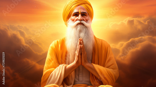 Serene spiritual leader in meditation with an orange turban and robe against a sunset