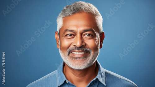 Confident mature man with a beaming smile and stylish grey hair, dressed casually on a blue background