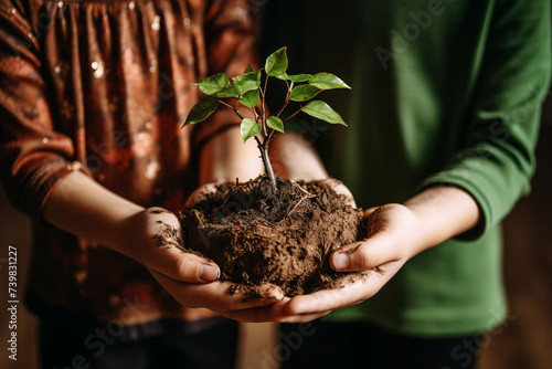 Child's hands holding a young plant in soil, symbolizing growth and environment care
