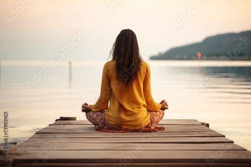 Serene woman meditating on a wooden pier at sunset, reflecting on calm water