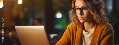 Focused businesswoman working on a laptop in a cozy cafe setting
