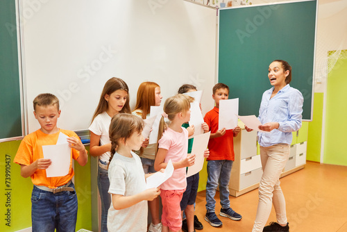 School children singing choir with female teacher