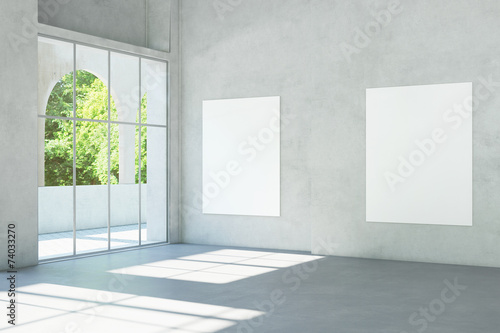 Modern minimalist interior with concrete walls and large floor-to-ceiling windows