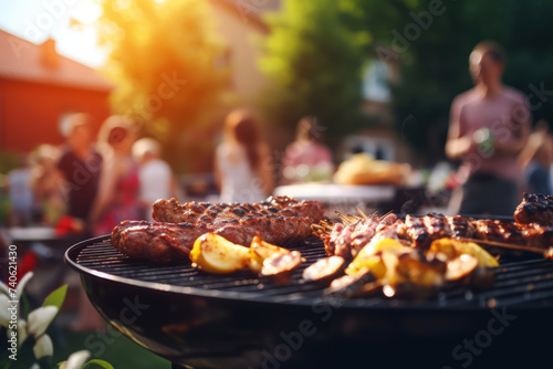 Barbecue grill with sizzling meat during a gathering in the outdoors