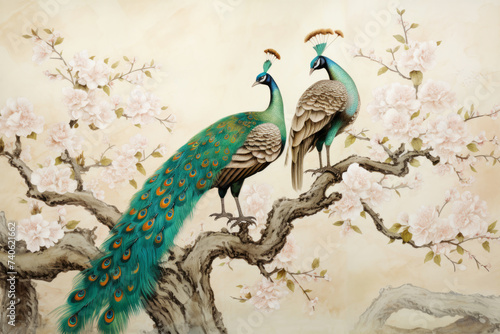 Elegant peacocks on a blooming tree branch in a traditional Asian art style