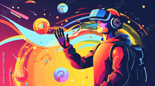 Vibrant illustration of a person experiencing virtual reality with vivid colors and abstract shapes