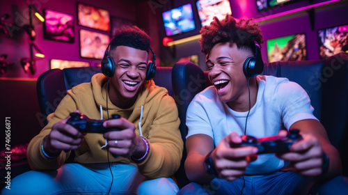 Two friends enjoying a competitive video game in a vibrant gaming room