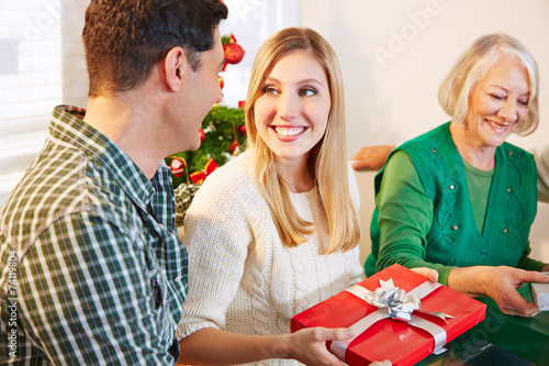 Mann gibt Frau Geschenk an Weihnachten