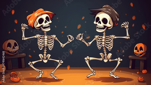 Funny cartoon skeletons dancing in playful Halloween celebration