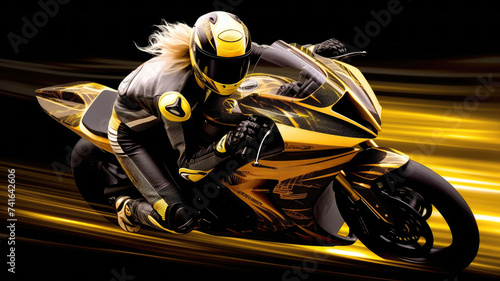 Motorcycle racer taking a corner on a black and yellow racing bike