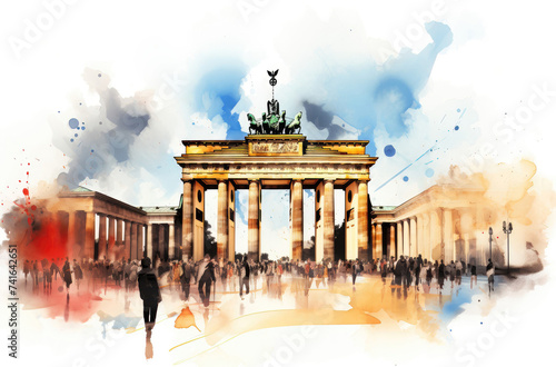 Watercolor illustration of Berlins Brandenburg Gate with crowds