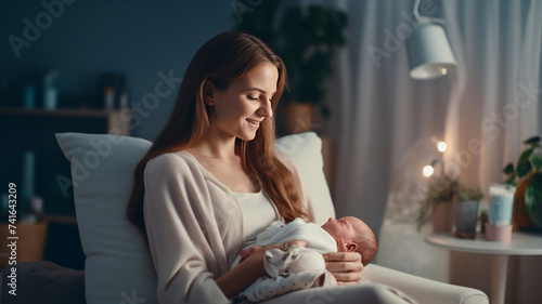 Glückliche Mutter mit Baby im Arm auf Sofa