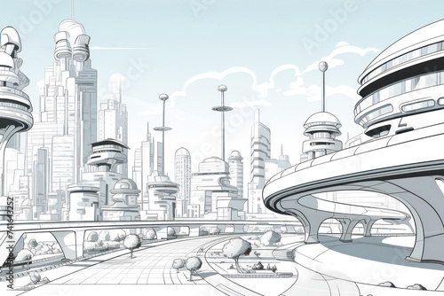 Modern futuristic cartoon city skyline with skyscrapers (Generative AI)