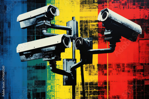 Colorful surveillance cameras on grungy abstract background for security concepts