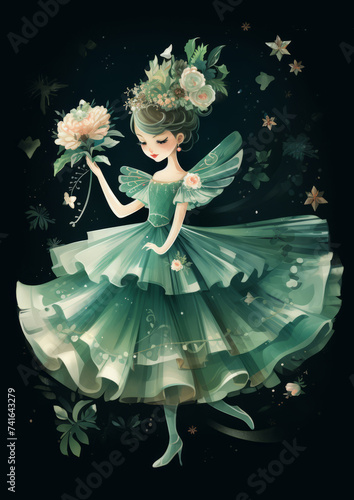 Elegant fairy in a whimsical garden, holding a large blooming flower surrounded by butterflies
