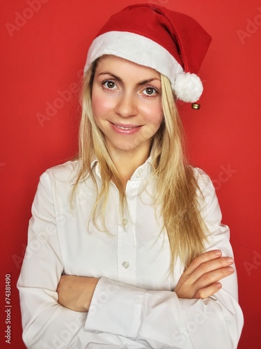 Stylish woman with white hair in red Santa outfit and sunglasses