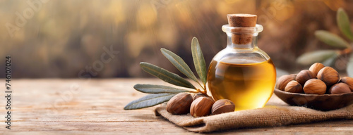 Argan oil and nuts displayed on rustic wooden background. The golden essence, treasured for its beauty benefits, is presented with its source nuts beside olive branches in a pastoral setting. #746107024