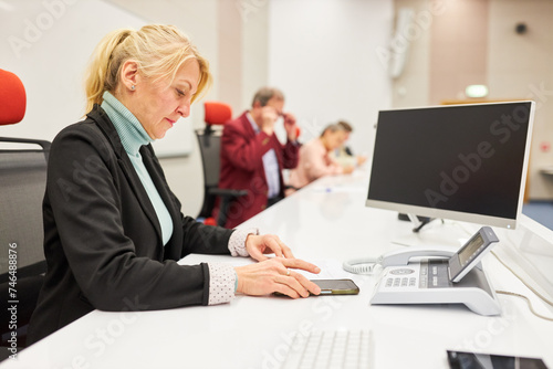 Professional answering during business conference in convention center