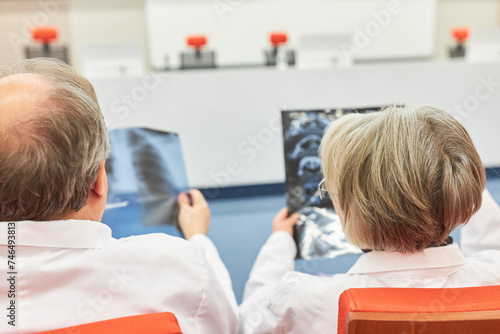 Doctors in audience examining medical x-ray at conference