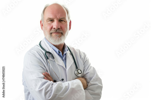 Confident mature male oncologist in white coat with stethoscope, healthcare professional portrait
