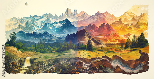 Vintage style illustration of a picturesque national park landscape with colorful mountains, trees, and a sunlit sky creating a serene and nostalgic atmosphere inspired by classic travel posters.