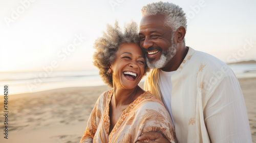 Black senior couple hugging at the beach during sunset