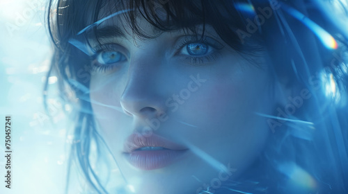 Radiant young girl with blue eyes and freckles in artistic lighting