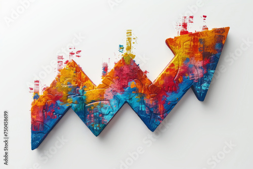 Colorful abstract zigzag growth arrow with artistic splashes on a plain background
