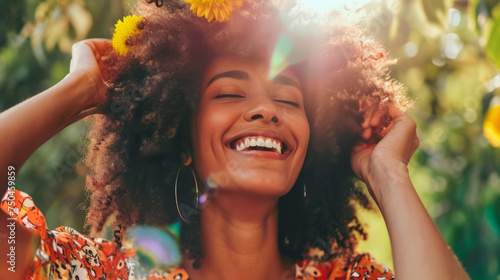 Joyful woman with vibrant curly hair enjoying a sunny day