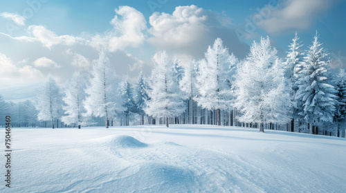 Serene snow-covered winter woodland with frosty trees under blue sky