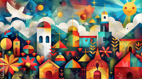 Colorful interfaith Easter illustration with churches, doves, and flowers