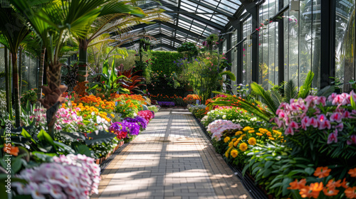 Moody botanical garden greenhouse with lush greenery and vibrant flowers