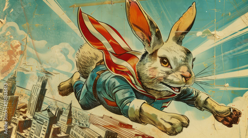Vintage comic book cover with Easter Bunny superhero flying over city