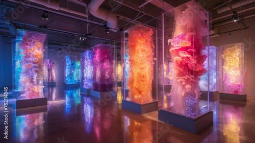 Vibrant bio-art exhibition with illuminated living organisms and technology