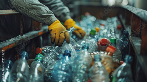 Close-up of employee hands in gloves sorting plastic bottles for recycling