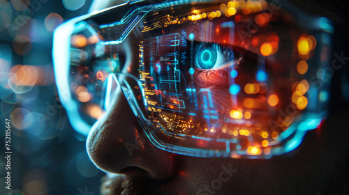 Innovative programmer wearing glasses with futuristic 3D interface around